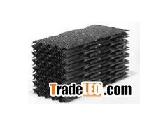 FB20 clog-resistant film fill is constructed of fire-retardant PVC sheets bonded to form blocks of cooling media. The surface microstructure facilitates air/water mixing and increases the surface cooling area. The offset vertical flutes provide directional changes in air and water flow to increase cooling and promote thermal efficiency while substantially reducing the occurrence of fouling.